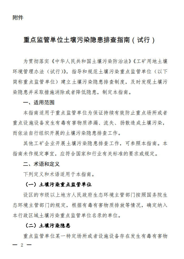 為貫徹落實(shí)《中華人民共和國(guó)土壤污染防治法》,規(guī)范土壤污染重點(diǎn)監(jiān)管單位土壤污染隱患排查工作,我部制定了《重點(diǎn)監(jiān)管單位土壤污染隱患排查指南(試行)》,現(xiàn)予公布。本指南自公布之日起施行。