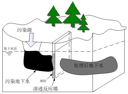 滲透性反應(yīng)墻技術(shù)是一種原位修復(fù)技術(shù),是指在地下水污染源的下游開挖溝槽,安置連續(xù)或非連續(xù)的滲透性反應(yīng)墻,在其中充填反應(yīng)介質(zhì),與流經(jīng)的地下水發(fā)生物理、化學(xué)和生物化學(xué)反應(yīng),使地下水中的污染物得以阻截、固定或降解。